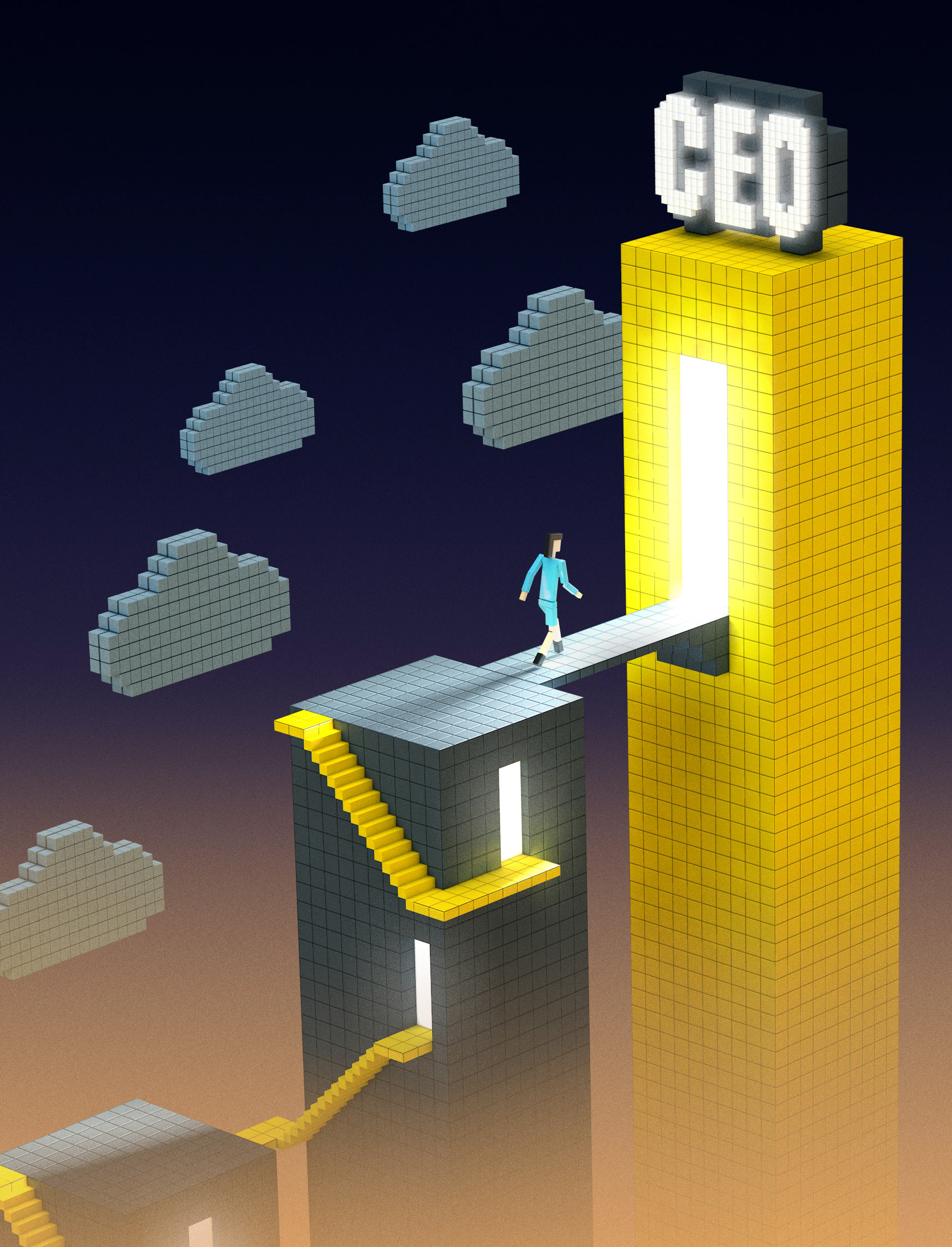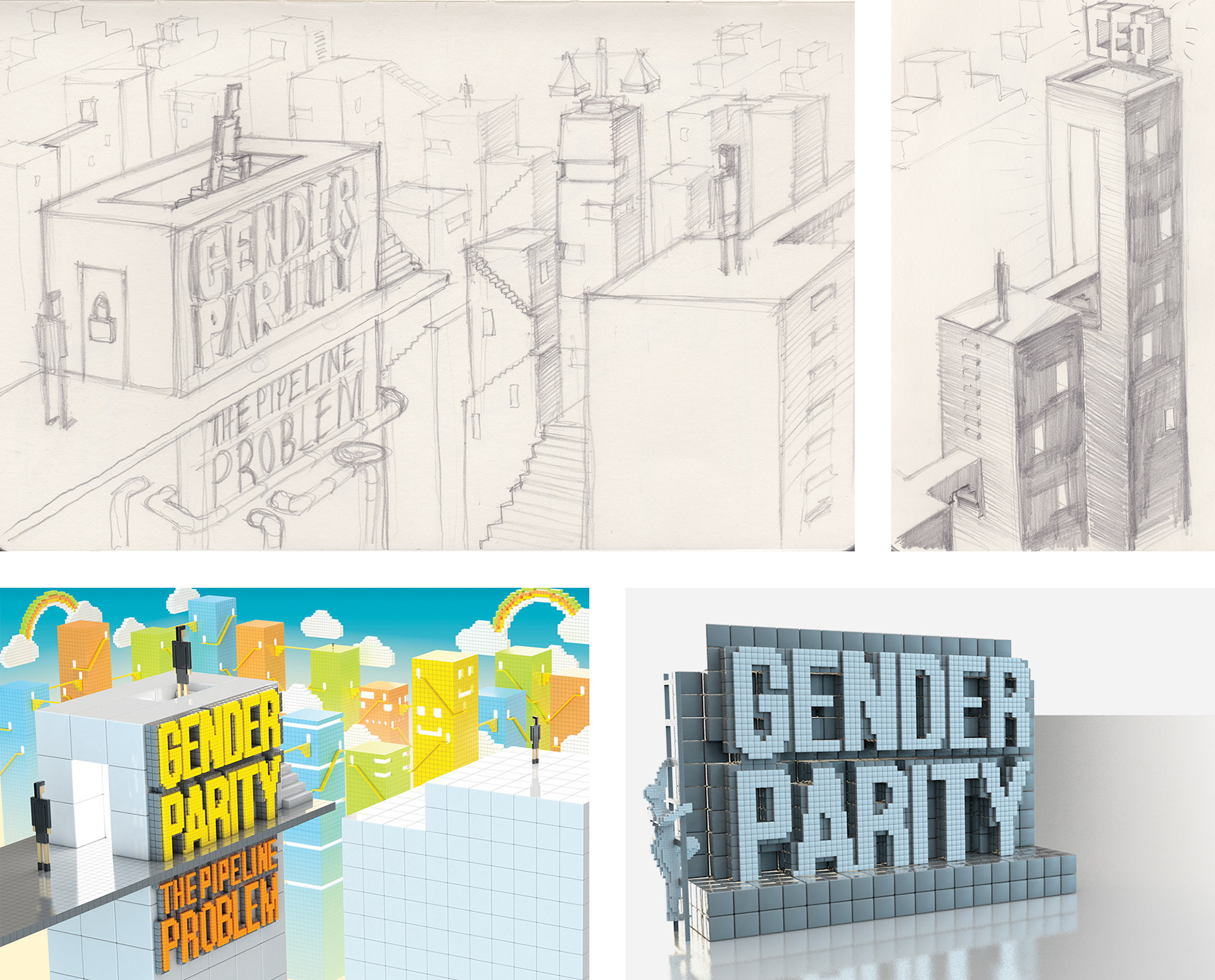 Process images. Top: sketches for both pieces. Bottom left: discarded direction that was much sunnier with a Rainbow Islands vibe. Bottom right: early experiments with voxels.